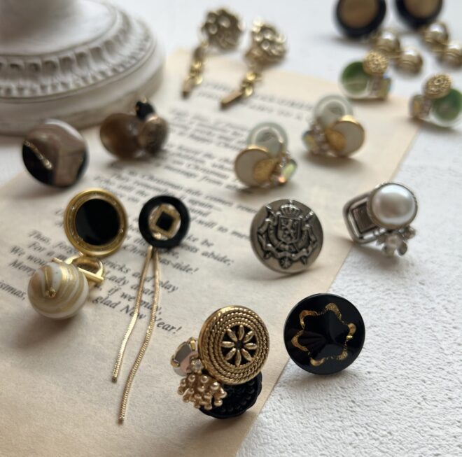 個性的なボタンなどのヴィンテージパーツや、長くお使いいただける金具を厳選し、