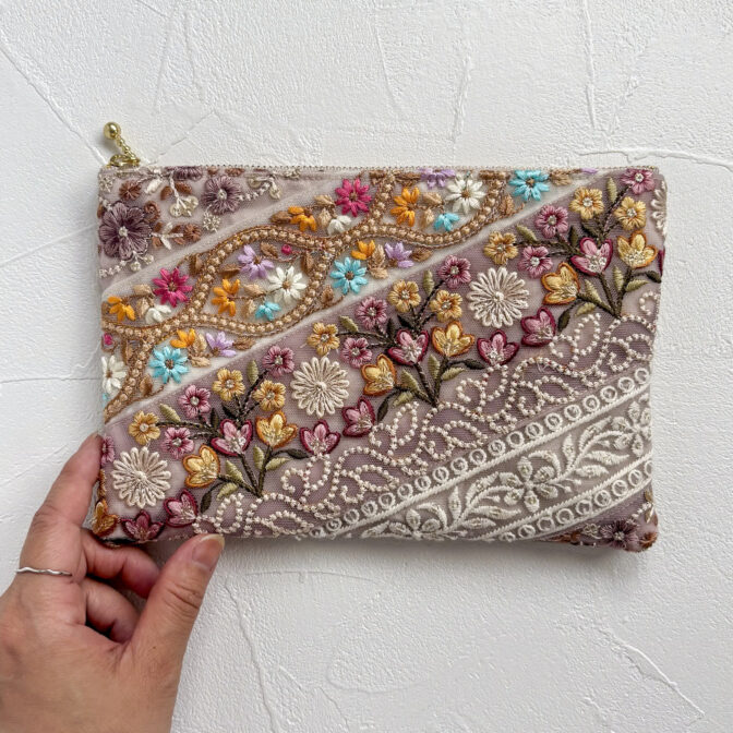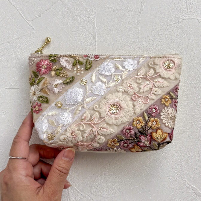 華やかで収納力のあるフラットポーチ、バッグのお供に最適なファスナーポーチ