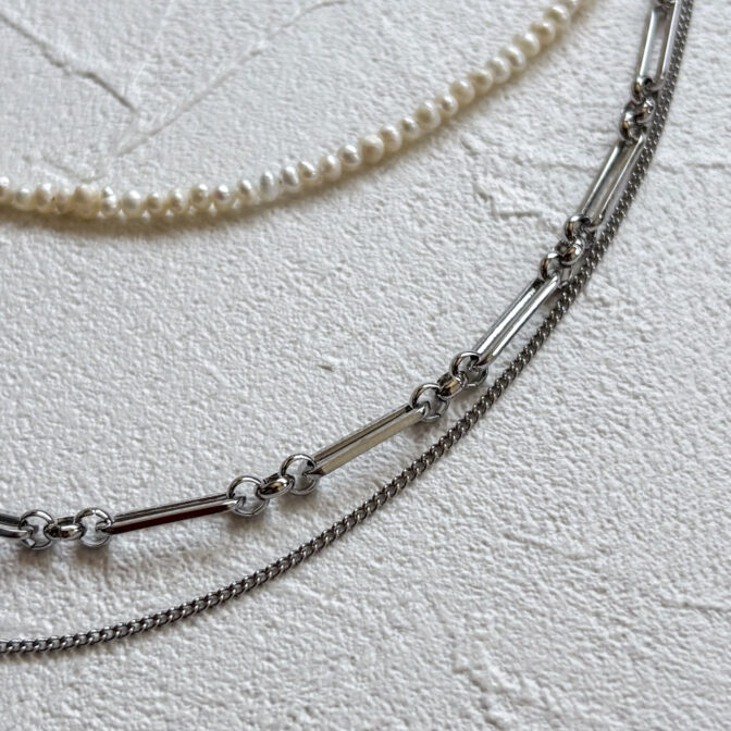 小粒の淡水パールとシルバーカラーのチェーンを組み合わせた華奢で上品な2連ネックレスです。