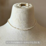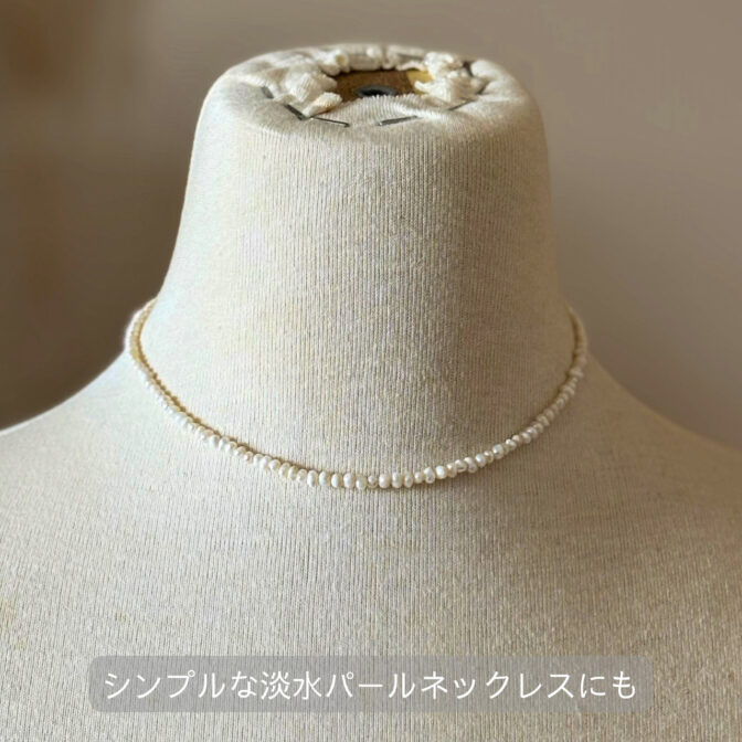 パールネックレスとしては短めで、デコルテラインに沿うミニマルなバランスが魅力です。