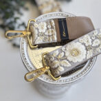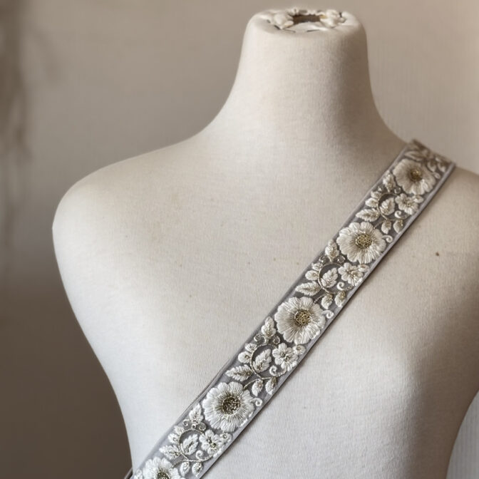 オーガンジーのベージュのインド刺繍リボンを贅沢に使用した太め幅(3.8㎝)のショルダーストラップです。